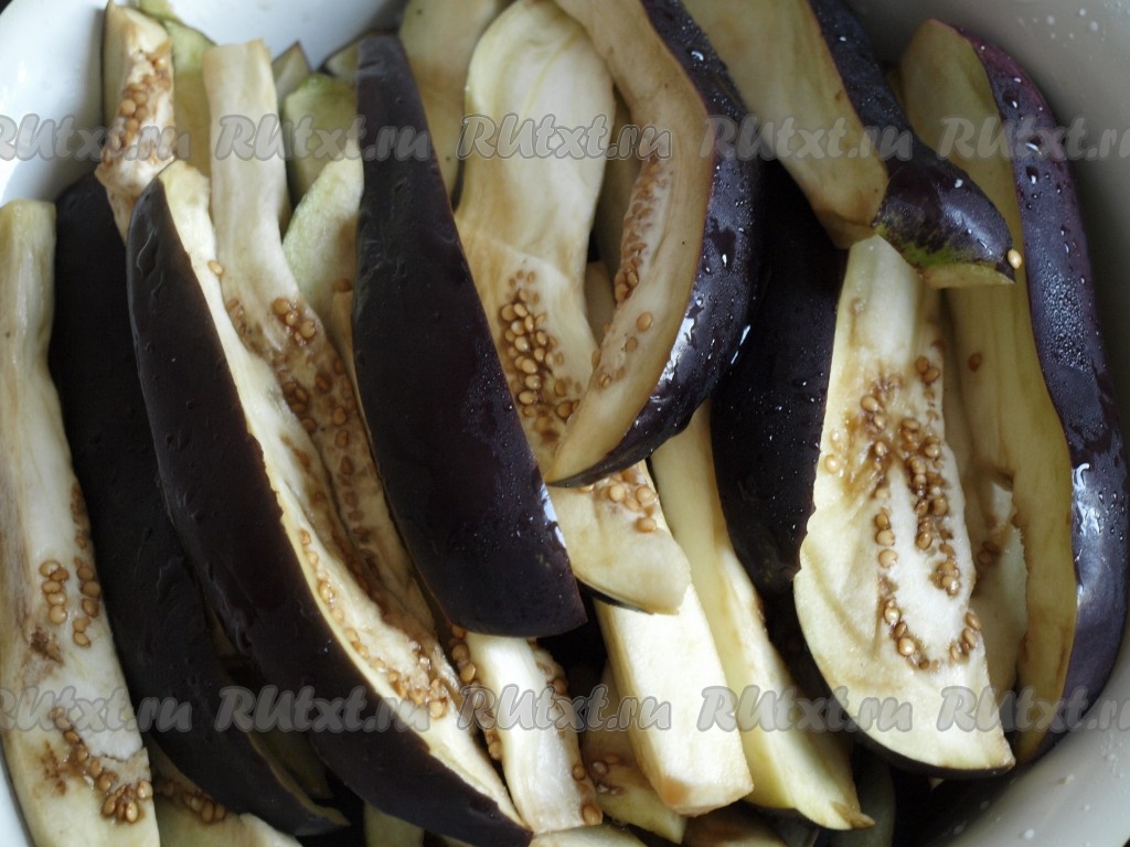 Баклажаны заранее нарезаем на полоски шириной 1,5-2 сантиметра, посыпаем 1 неполной столовой ложкой соли, слегка мнём руками и ставим на ночь в холодильник.