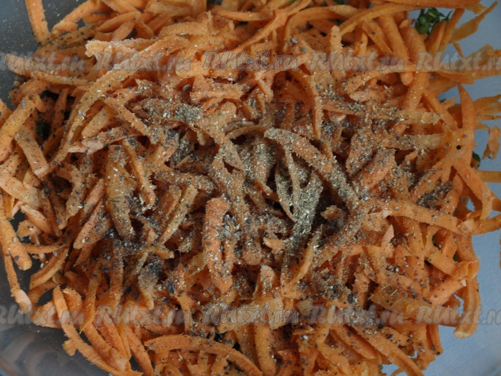 Кориандр измельчаем в ступке. Натираем морковь на корейской тёрке (если такой тёрки нет, можно натереть на крупной тёрке), перекладываем в достаточно объёмную миску. Морковку посыпаем измельчённым кориандром, чёрным и красным молотыми перцами.