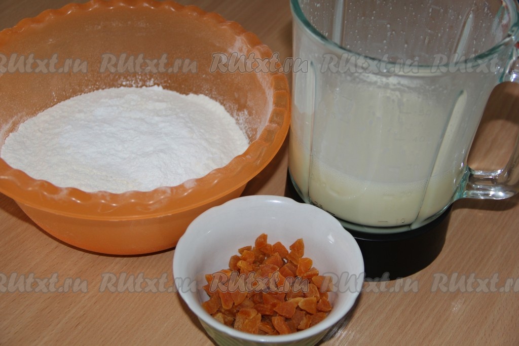 Обдаём курагу кипятком, а затем промываем, обсушиваем и режем на кусочки. Взбиваем яйца с сахаром миксером до увеличения в объёме и побеления массы (в течение минут 5). Затем в яичную смесь вливаем кефир, растительное масло и ещё раз хорошо взбиваем.