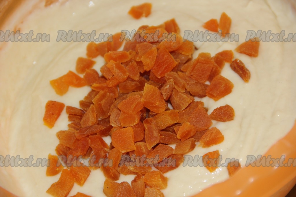 В полученную смесь всыпаем разрыхлитель и начинаем частями добавлять просеянную муку. Перемешиваем тесто ложкой. Тесто должно получиться, как сметана средней густоты. Муки, возможно, понадобится чуть меньше или больше, чем указано в ингредиентах. Тут лучше ориентироваться не на количество муки, а на консистенцию теста. Курагу добавляем в тесто и тщательно перемешиваем. Форму для выпечки смазываем растительным маслом (если используете силиконовую форму, тогда смазывать её не нужно). Выкладываем тесто в форму, заполняя её на 2/3 объёма и ставим в заранее разогретую духовку.