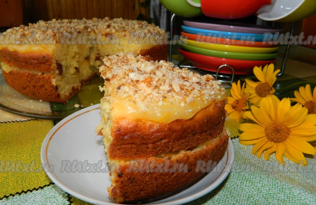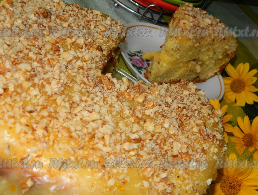 Смазываем верх творожного пирога горячим соусом (я пирог разрезала на 2 коржа и смазала ещё и между коржами). Сверху посыпаем ореховой крошкой и можно подавать к столу.