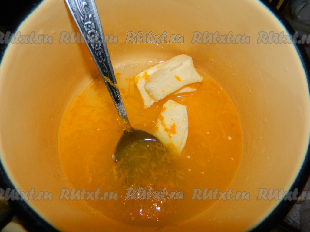 Когда пирог будет готов, приступаем к приготовлению соуса (чтобы пирог лучше пропитался, его лучше смазывать горячим апельсиновым соусом). Нагреваем сливочное масло, апельсиновую цедру, 100 мл апельсинового сока, лимонный сок и сахар.