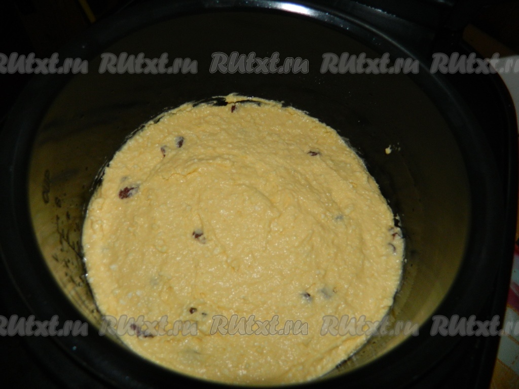 Добавляем в тесто изюм и выливаем в чашу мультиварки. Готовим творожный пирог 50 минут на режиме "Выпечка".