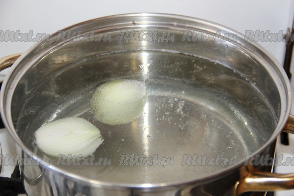 В кастрюле доводим до кипения 2-2,5 литра воды, затем добавляем очищенную целую (или разрезанную пополам) луковицу.