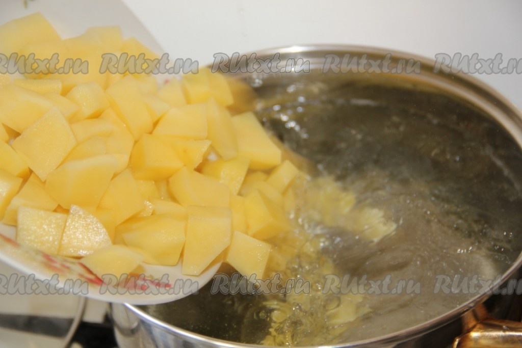 Картофель чистим, режем на кубики среднего размера и добавляем в кастрюлю.