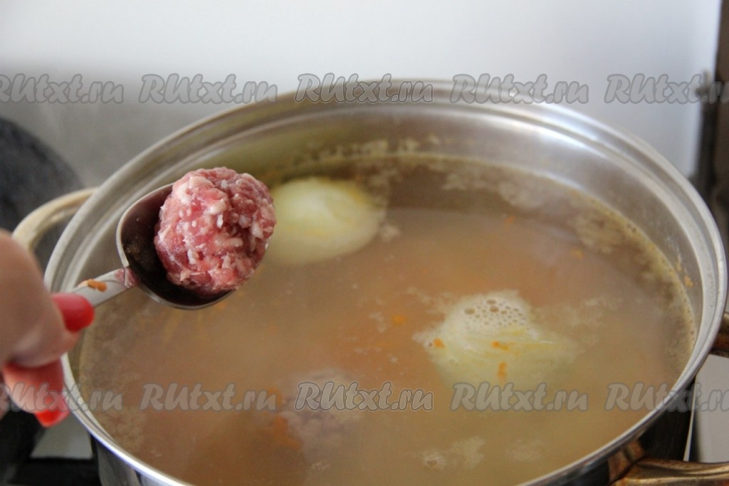 Теперь в суп с рисом, морковкой и картошкой добавляем фрикадельки, лавровый лист, солим, перчим, доводим до кипения, а затем варим на небольшом огне 20-25 минут (и картошка, и рис должны стать достаточно мягкими).