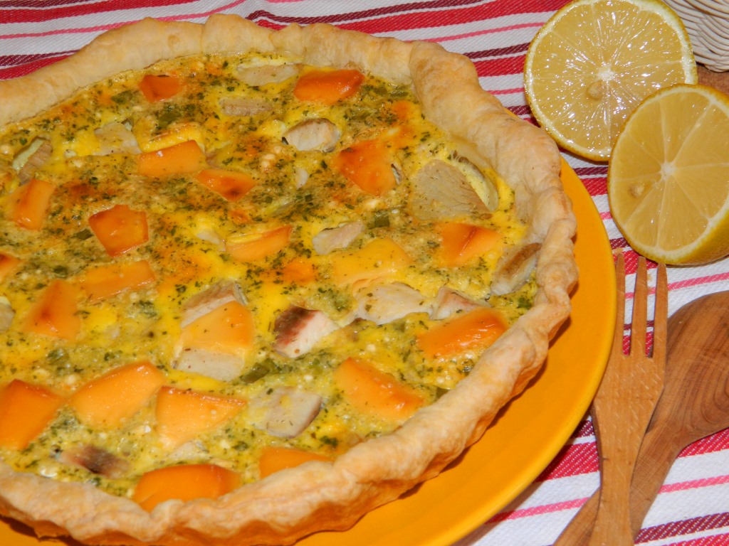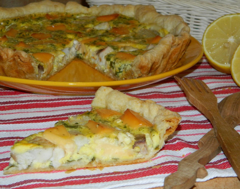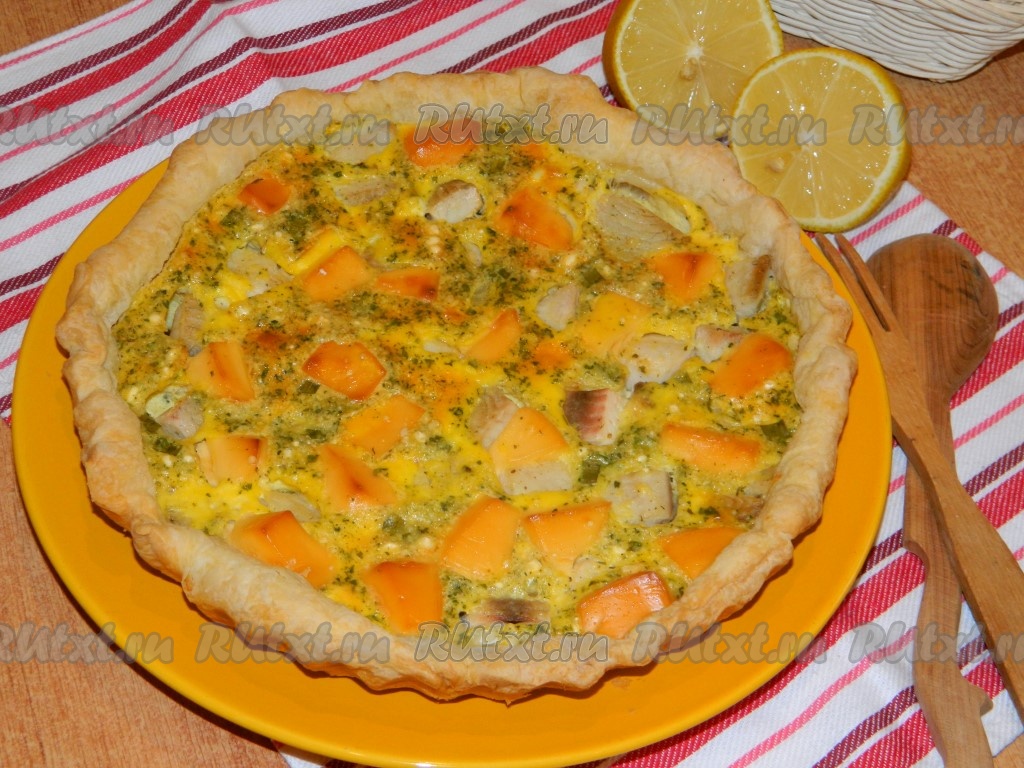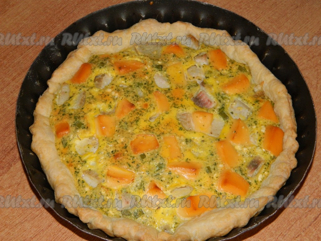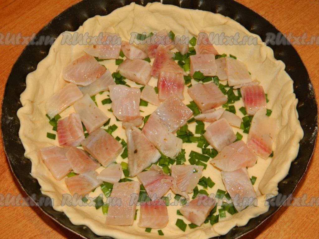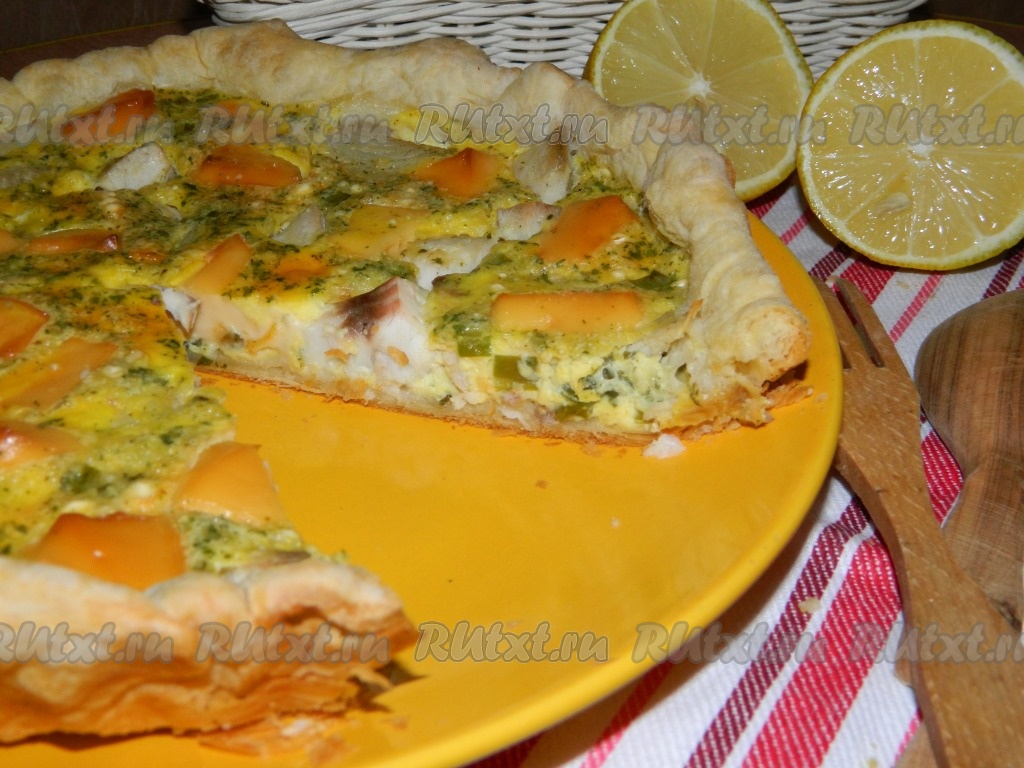 Вкусный, нежный, очень ароматный киш, приготовленный из слоёного теста с рыбой, подать к столу.