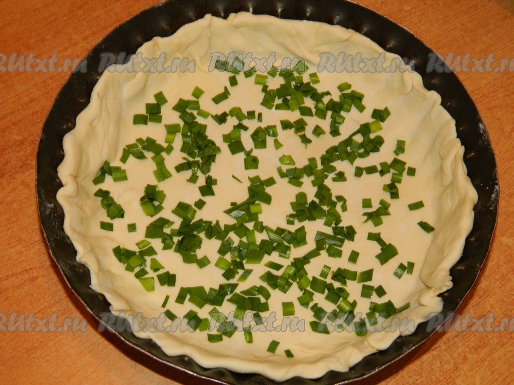 Тесто слегка раскатать на присыпанной мукой поверхности. Форму для выпечки смазать растительным маслом. В форму для выпечки выложить раскатанное тесто, формируя небольшие бортики. По желанию, посыпать тесто мелко нарезанным зелёным луком.