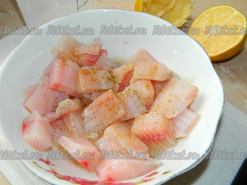 Слоёное тесто разморозить при комнатной температуре. Если филе рыбы заморожено, полностью разморозить его. Нарезать филе рыбы на небольшие кусочки, посолить, поперчить, полить соком лимона, перемешать.
