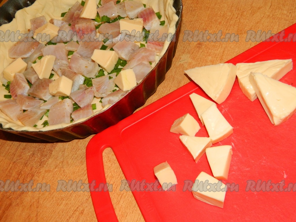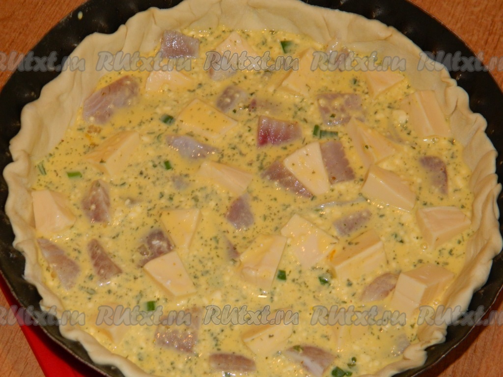 Влить заливку поверх рыбы с сыром и отправить форму с кишем в разогретую духовку, выпекать при температуре 200 градусов минут 45-60 минут (на выпечке должна появиться красивая румяная корочка).