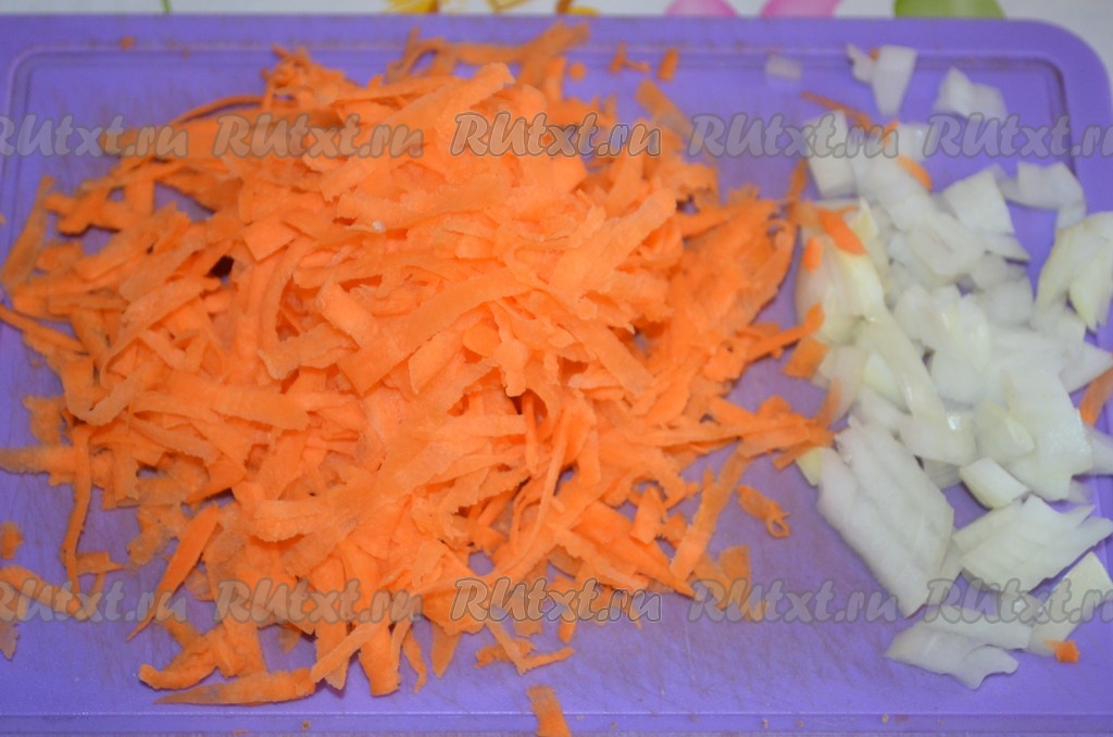 Морковь натрите, лук порежьте кубиками.