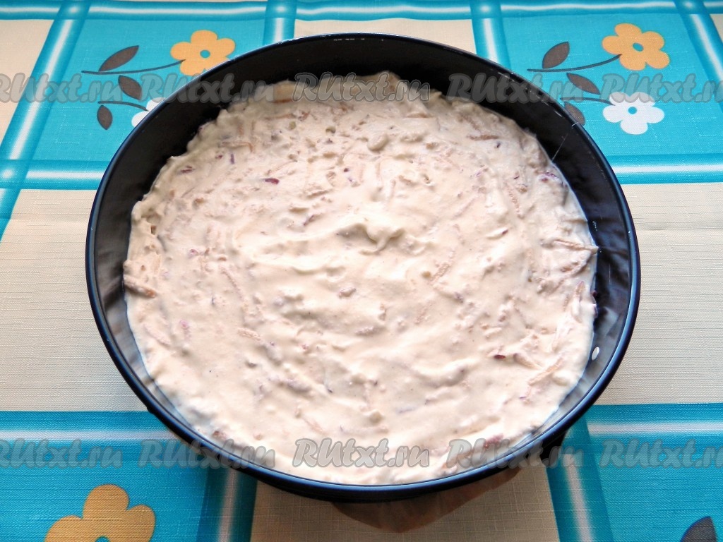 Форму для выпечки диаметром 21 сантиметр застелить пергаментом, немного смазать сливочным маслом бока и дно формы. Выложить творожно-яблочное тесто в форму. Выпекать запеканку в разогретой до 180 градусов духовке примерно 55-60 минут.