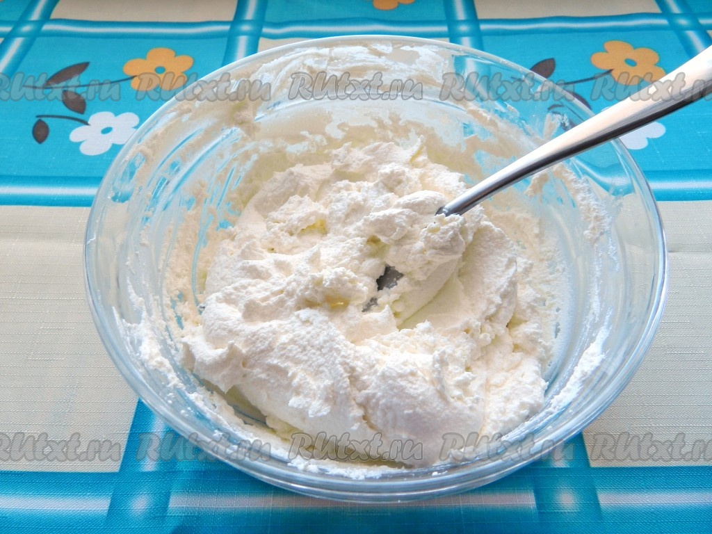 В творог добавить соду и растереть вилкой (или столовой ложкой) в более однородную массу. Также можно пробить творог погружным блендером или перетереть через железное сито.