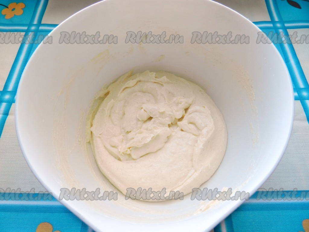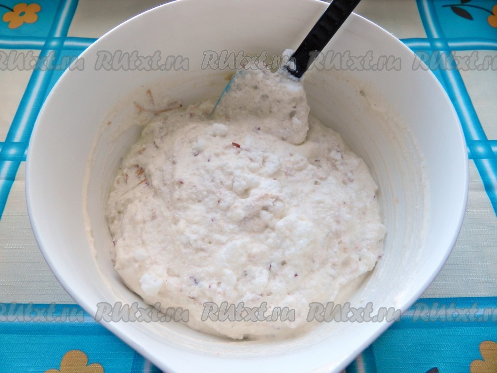 В получившуюся смесь добавить творог и манную крупу, тщательно перемешать творожное тесто.