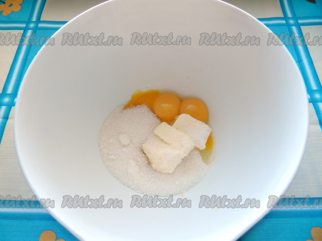 Яйца, сахар и сливочное масло комнатной температуры взбить миксером до однородности.