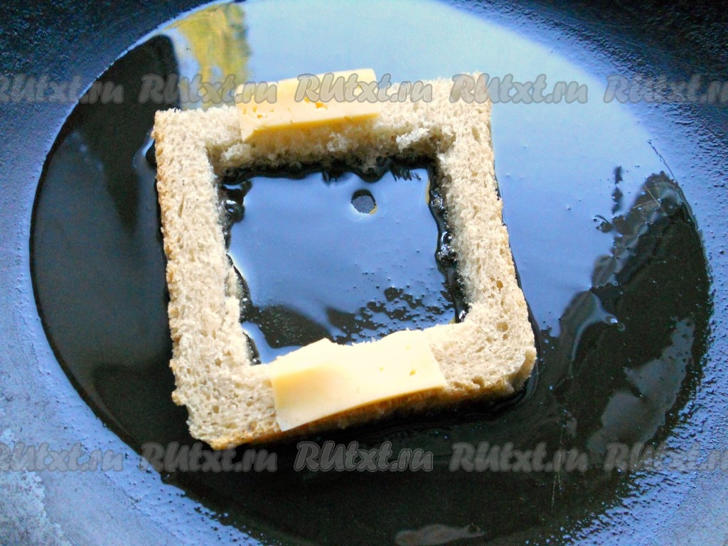 В сковороду влить растительное масло, нагреть. Огонь сделать минимальным. Поместить в сковороду один подготовленный ломоть хлеба. На края, с двух сторон, поместить по тонкому кусочку сыра.