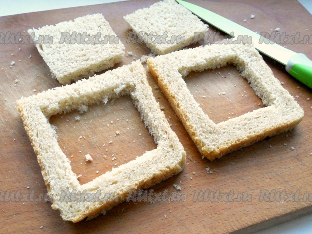 В ломтиках хлеба аккуратно вырезать ножом серединку, оставляя только края, шириной около 1 см.