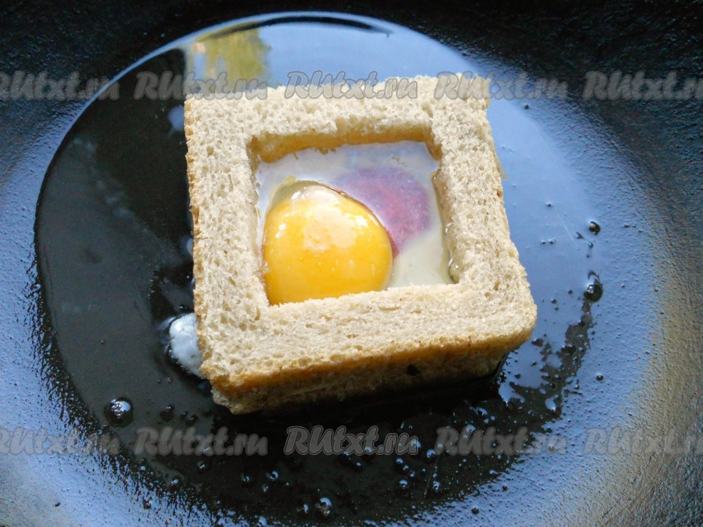 И далее нужна будет сноровка. Следует аккуратно, но быстро, с помощью лопатки перевернуть бутерброд на другую сторону так, чтобы яйцо не выпало. Жарить 2 минуты. Желток в бутерброде остается жидким, а белок хорошо прожаривается. Если хотите, чтобы желток не был сырым, следует жарить под закрытой крышкой больше времени (минуты 4).
