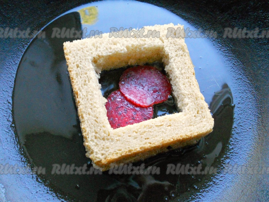 Сверху накрыть вторым ломтем хлеба, чуть придавить. В серединку поместить пару кусочков колбаски.