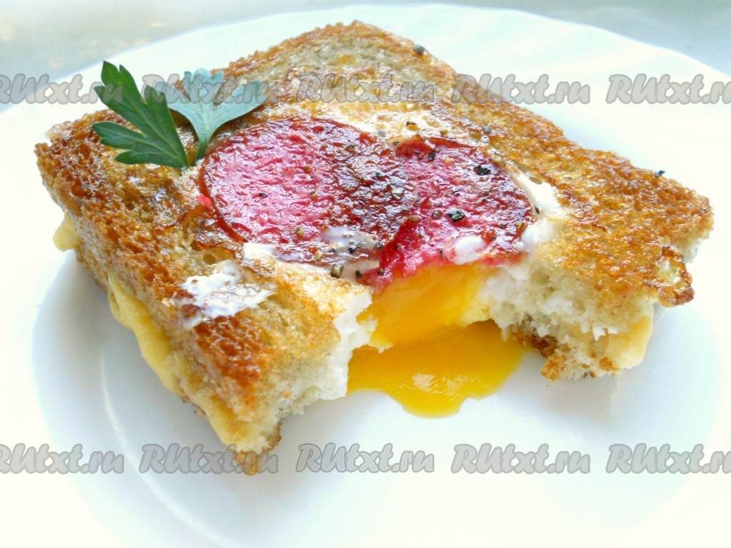 Готовые вкусные и сытные горячие бутерброды с яйцом, приготовленные на сковороде, поперчить и сразу же подать к столу.