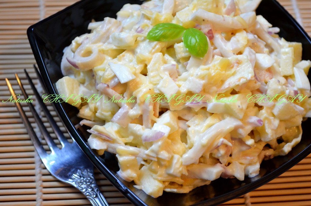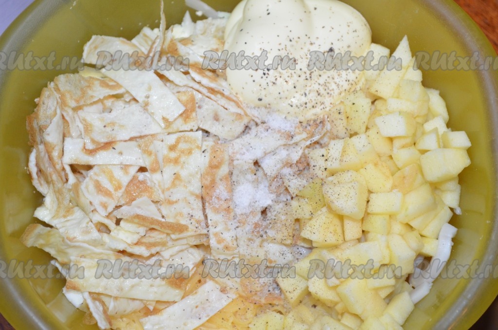 Кальмары, сыр, яблоко, лук, яйца, блинчики поместить в глубокую миску, посолить салат, поперчить, заправить майонезом (или сметаной), перемешать.