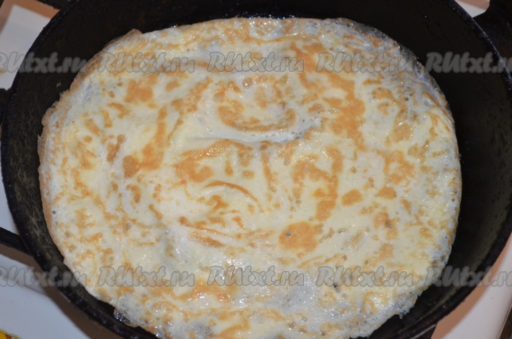 Жарить яичный блинчик на среднем огне до подрумянивания с двух сторон, затем переложить на тарелку. Аналогично взбить вилкой ещё 1 сырое яйцо с небольшим количеством соли и тоже пожарить блинчик на сковороде, смазанной маслом.