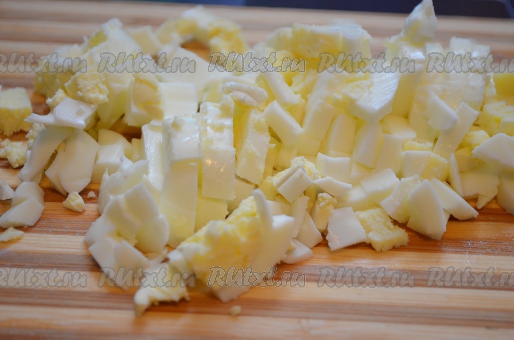 Отварить 2 яйца в течение 10 минут после закипания воды, а затем остудить их, очистить, нарезать на небольшие кубики.