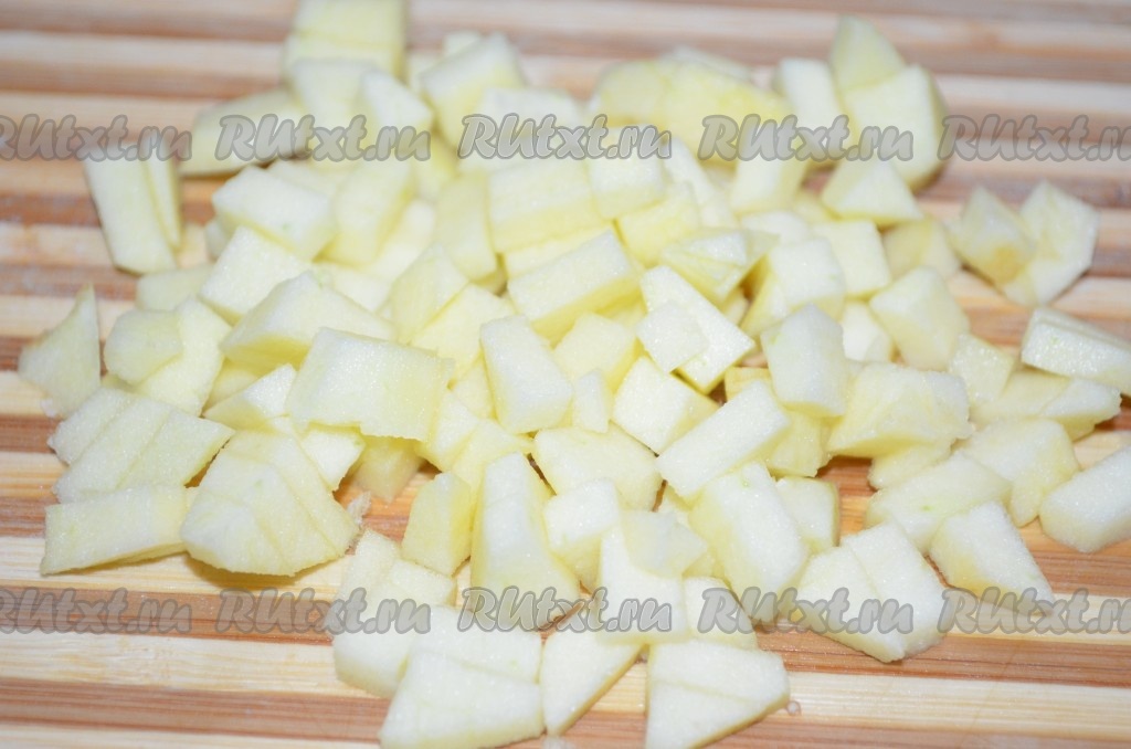 Яблоко очистить от кожуры и семенной коробки с семечками, нарезать на мелкие кубики.