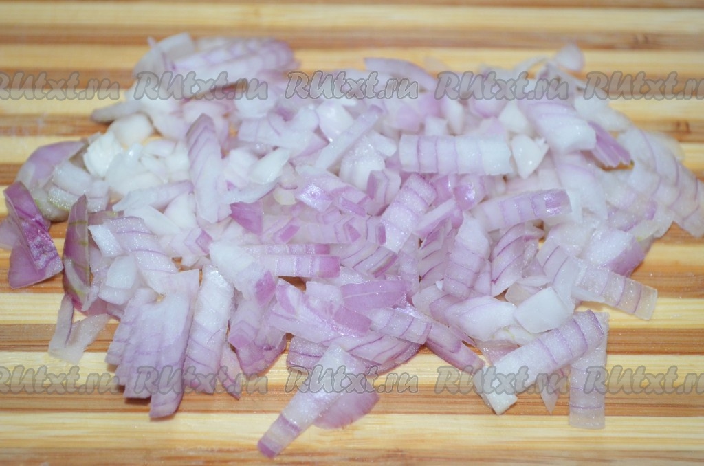 Лук очистить, нарезать на мелкие кубики. Я использовала красный лук, он не горчит.