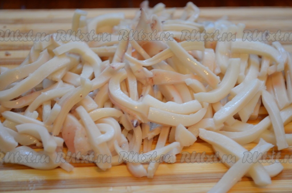 Для того чтобы сварить кальмара, его нужно опустить в кипящую воду и варить 2 минуты после закипания воды. Затем остудить, очистить от плёнок и хорды. Отварного кальмара нарезать мелкой соломкой.