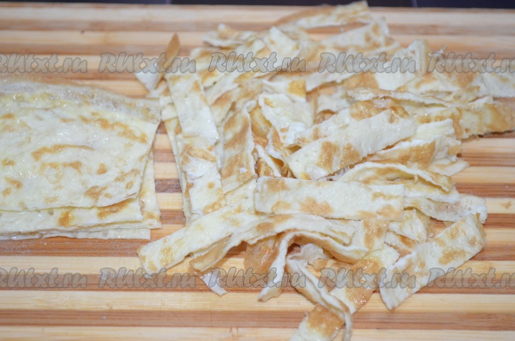 Полностью остудить яичные блинчики, нарезать их соломкой, как на фото.
