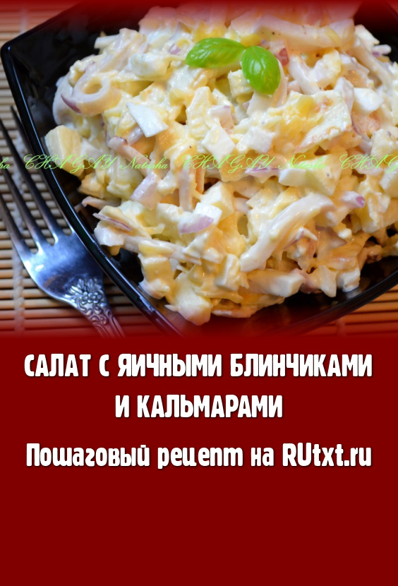 Все уже, наверно, заметили, что я люблю готовить салаты с кальмарами, такими вкусными и полезными. На этот раз предлагаю рецепт салата с яичными блинчиками и кальмарами. Вкус закуски мягкий, нежный и немного пикантный. Вам понравится!
