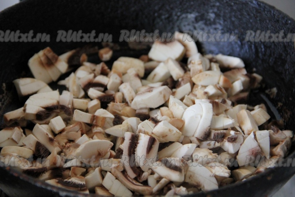 Такие котлеты можно приготовить не только с шампиньонами, но и с предварительно отваренными в течение 25-30 минут лесными грибами. Свежие шампиньоны нужно промыть водой, убирая загрязнения. Шампиньоны (или предварительно отваренные лесные грибы) мелко нарезаем. Лук очищаем и тоже мелко нарезаем. В сковороде прогреваем растительное масло, выкладываем нарезанный лук и обжариваем его минуты 3-4 (до прозрачности), не забывая иногда помешивать, на среднем огне. К обжаренному луку выкладываем нарезанные грибы, обжариваем минут 8-10, периодически перемешивая. В конце жарки солим немного грибную начинку для котлет.