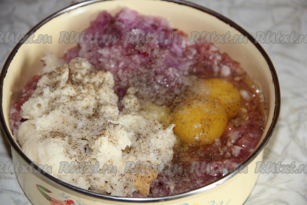 Белый хлеб замачиваем в молоке, а затем слегка отжимаем, чтобы избавиться от лишней влаги. Фарш можно купить в магазине или пропустить через мясорубку кусочек мяса. Для таких котлет отлично подойдёт и свиной, и говяжий, и свино-говяжий, и куриный фарш. Фарш перекладываем в миску, добавляем яйца, хлеб, отжатый от лишнего молока, соль, чёрный молотый перец, манку, перемешиваем до однородности. Оставляем фарш постоять минут на 10, чтобы манка немного набухла.