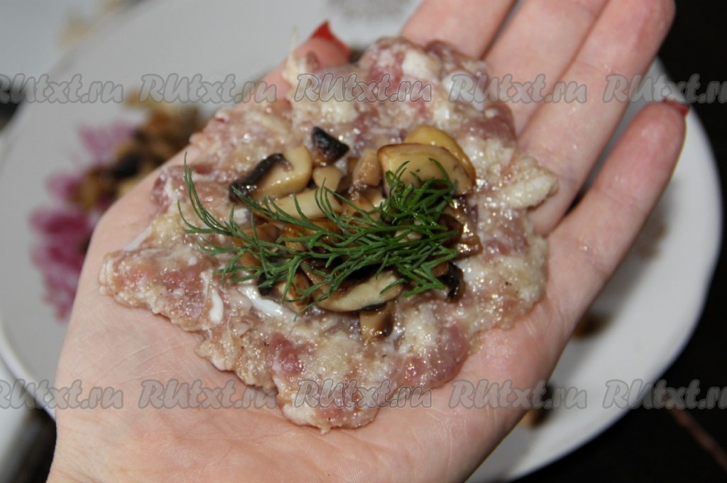 Из части фарша формируем лепёшку. В центр лепешки кладём немного жареных грибов и, по желанию, веточку укропа (как на фото), поднимаем края мясной лепёшки вверх и защипываем, формируя котлету. Таким образом формируем все мясные котлеты с грибами внутри.