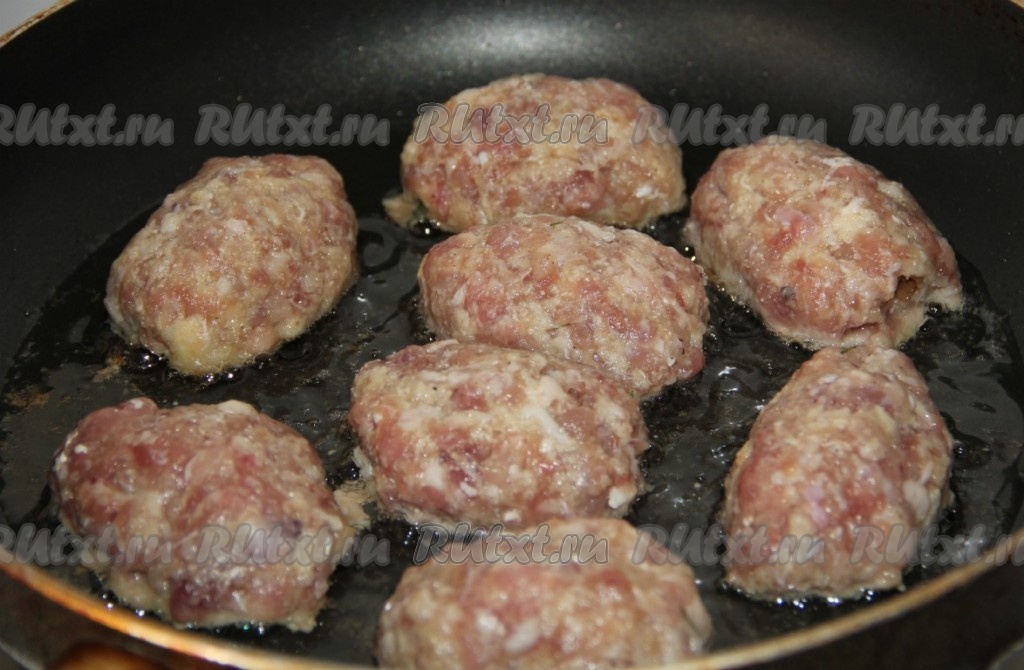 Котлеты, фаршированные грибами, выкладываем на сковороду, разогретую с растительным маслом, обжариваем с двух сторон на среднем огне до золотистого цвета. В принципе, котлеты готовы. Но я их ещё обычно протушиваю, для этого в сковороду с жареными котлетами вливаю немного воды, накрываю крышкой, даю воде закипеть, уменьшаю огонь до минимума и тушу в течение минут 10.