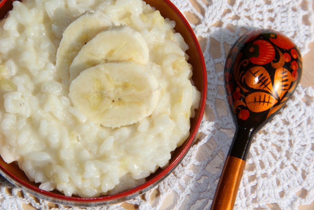 Подаём вкусную рисовую кашу с кусочками банана.