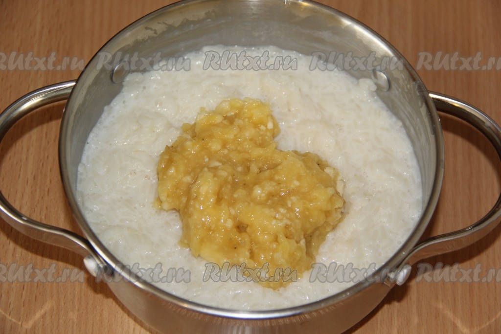 Готовую рисовую кашу убираем с плиты, добавляем сливочное масло, банановое пюре и перемешиваем. Закрываем кастрюлю крышкой и даём настояться 10-15 минут.