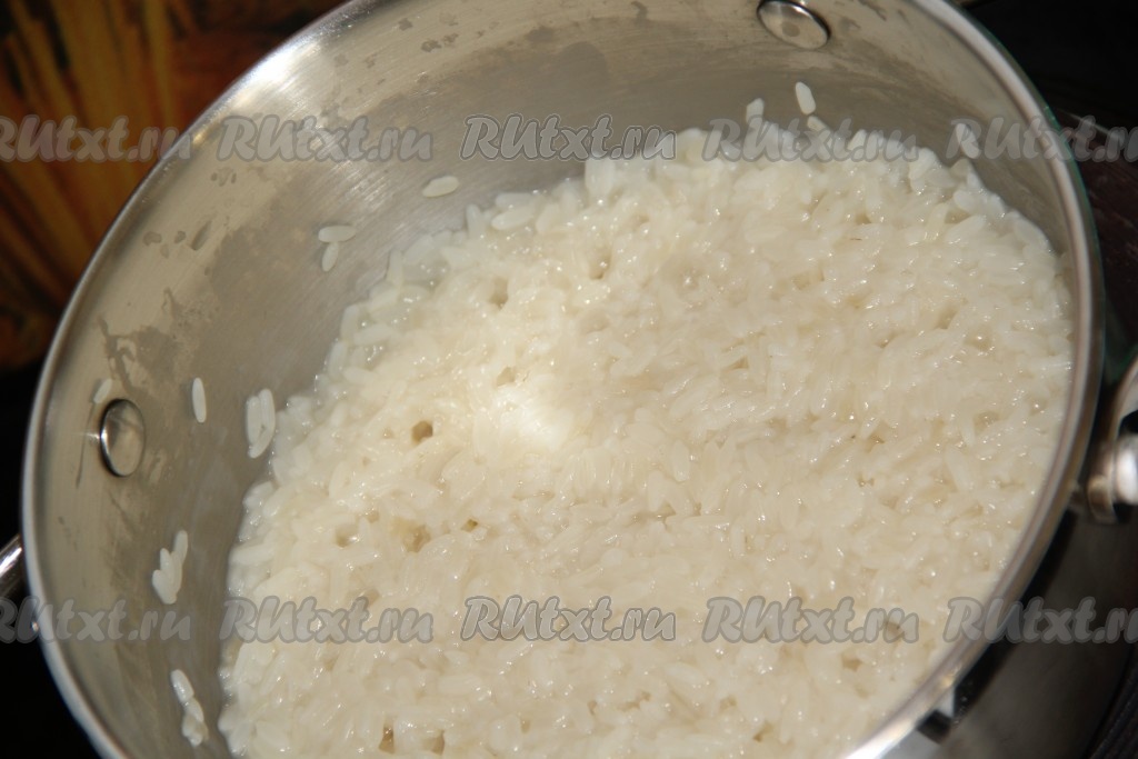Рис промываем под проточной водой, заливаем его 300 мл воды, солим и варим 20 минут на среднем огне (до полного испарения воды).
