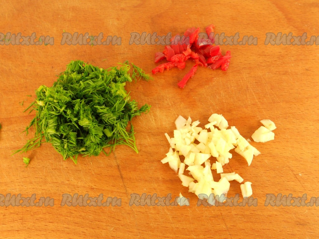 Чеснок и острый перец мелко порезать, укроп измельчить. Смешать все ингредиенты.