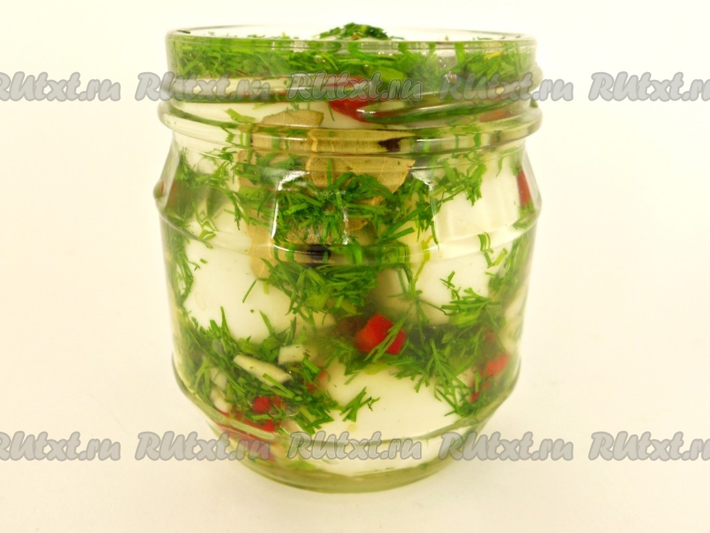 В баночку (для 10 яиц хватает вполне баночки объемом 250 мл) выкладывать яйца, пересыпая их смесью из чеснока, укропа и перца.