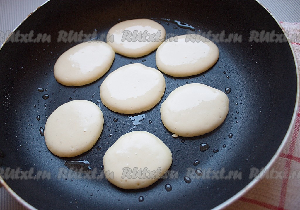 Блинчики жарить на разогретой антипригарной сковороде, смазанной растительным маслом: наливать тесто маленькими порциями (по 1 чайной ложке), когда тесто схватится, блинчики перевернуть и выпекать с другой стороны.