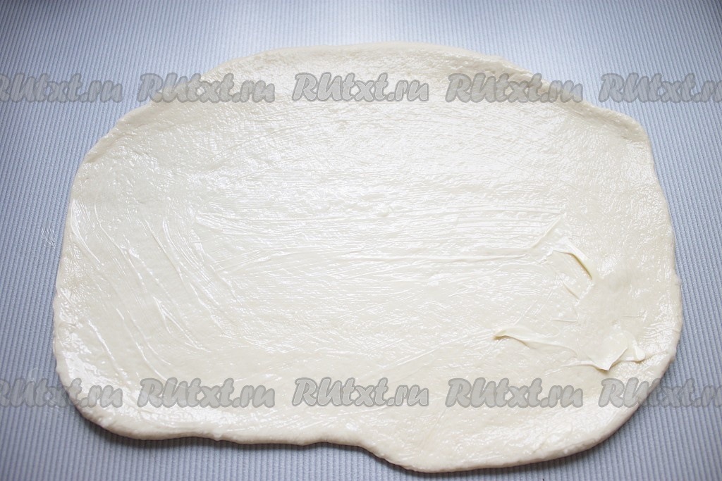 Готовое тесто разделить на 4 части, каждую раскатать в прямоугольник толщиной 1 см, поверхность смазать размягченным сливочным маслом (по 15 грамм на рулет).