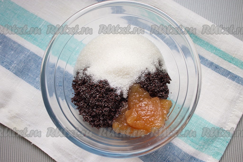 Для приготовления начинки: мак залить кипятком, оставить минут на 15, затем воду слить и снова залить кипятком, затем отжать через марлю. Мак соединить с сахаром и повидлом, тщательно перемешать, можно растереть толкушкой.
