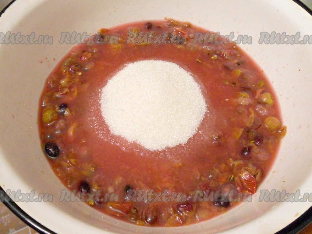 Перемешать хорошо и оставить на 2 часа. После этого поставить миску с виноградом на огонь, дать закипеть. Варить на самом слабом огне, периодически помешивая, до уменьшения содержимого в объеме в 2 раза.