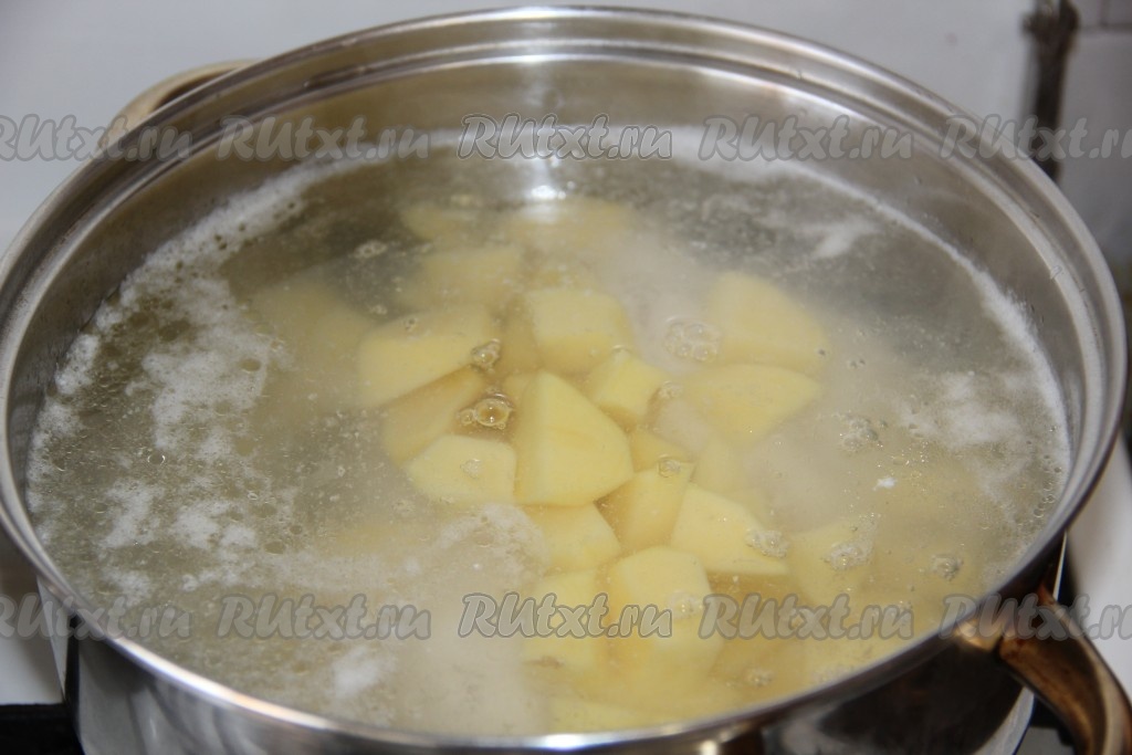Вымытые части курицы поместить в кастрюлю, в которой будете варить суп, влить 2 литра воды, поставить на огонь. После закипания убрать с поверхности пену и варить мясо минут 25-30. Затем убрать кастрюлю с огня, кусочки курицы достать из бульона, дать немного остыть, отделить от костей. Процедить бульон, вернуть его в кастрюлю, поставить на огонь. После закипания бульона выложить в кастрюлю очищенный картофель, нарезанный на средние кусочки, и мясо курицы без костей.