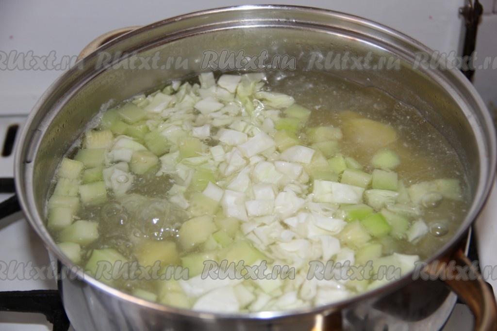 Следом добавить в овощной суп капусту, нарезанную на небольшие кубики (или на тонкие полоски).