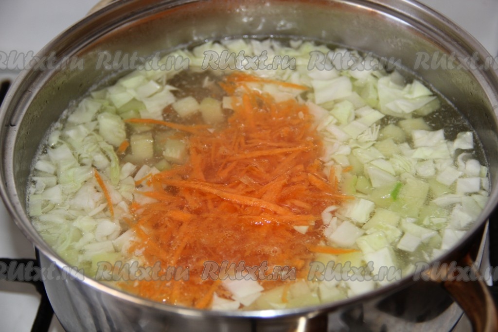После этого добавить в кастрюлю очищенную морковку, натёртую на крупной тёрке.