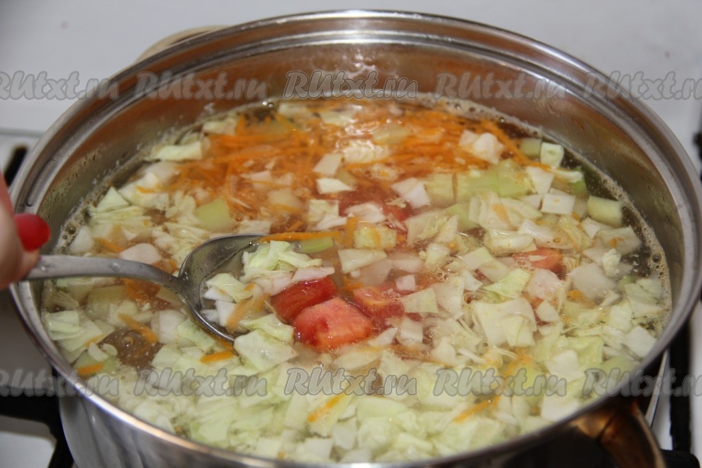 Следующим добавить очищенный от зёрен и мелко нарезанный болгарский перец. Все овощи (картофель, кабачок, капусту, морковь, помидор, болгарский перец) добавляем в наш суп практически одновременно. Дать овощному супу закипеть и варить минут 15-20 (до мягкости картошки и капусты) на небольшом огне.
