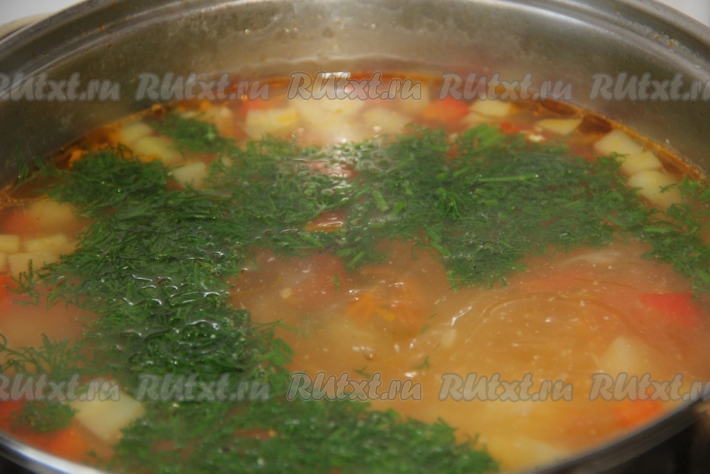 Когда картофель с капустой будут готовы, добавить в суп мелко нарезанную зелень, соль, чёрный молотый перец, довести до кипения, проварить на небольшом огне 2-3 минуты и убрать с огня. Дать настояться под крышкой в течение минут 10.
